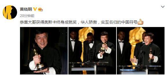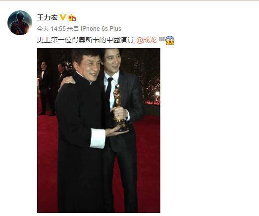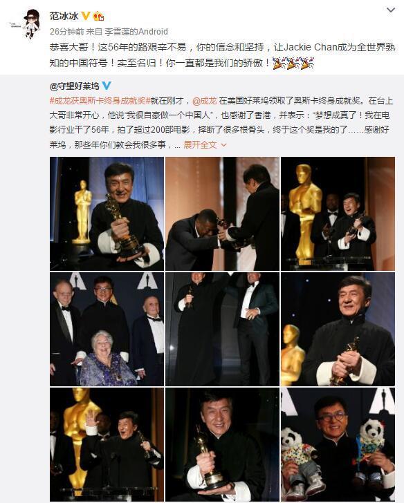 成龙和史泰龙 当地时间11月12日,成龙现身好莱坞被授予奥斯卡终身成就荣誉奖。在领奖的时候,成龙感谢了妻子和儿子,也感谢了成家班和观众。同时他还强调说,感谢香港,自己作为中国人非常骄傲。 成龙获奖不少明星也在微博上发文庆祝成龙获奖,范冰冰发文写道“恭喜大哥!这56年的路艰辛不易,你的信念和坚持,让Jackie Chan成为全世界熟知的中国符号!实至名归!你一直都是我们的骄傲!” 黄晓明写道“恭喜大哥获得奥斯卡终身成就奖,华人骄傲,实至名归的中国符号”。 李冰冰写道“恭喜大哥!世界电影史上永远的Jackie Chan!华人的骄傲!!” 王力宏除了现身颁奖礼在现场为成龙助阵也在微博晒出二人的合照并写道“史上第一位得奥斯卡的中国演员@成龙”